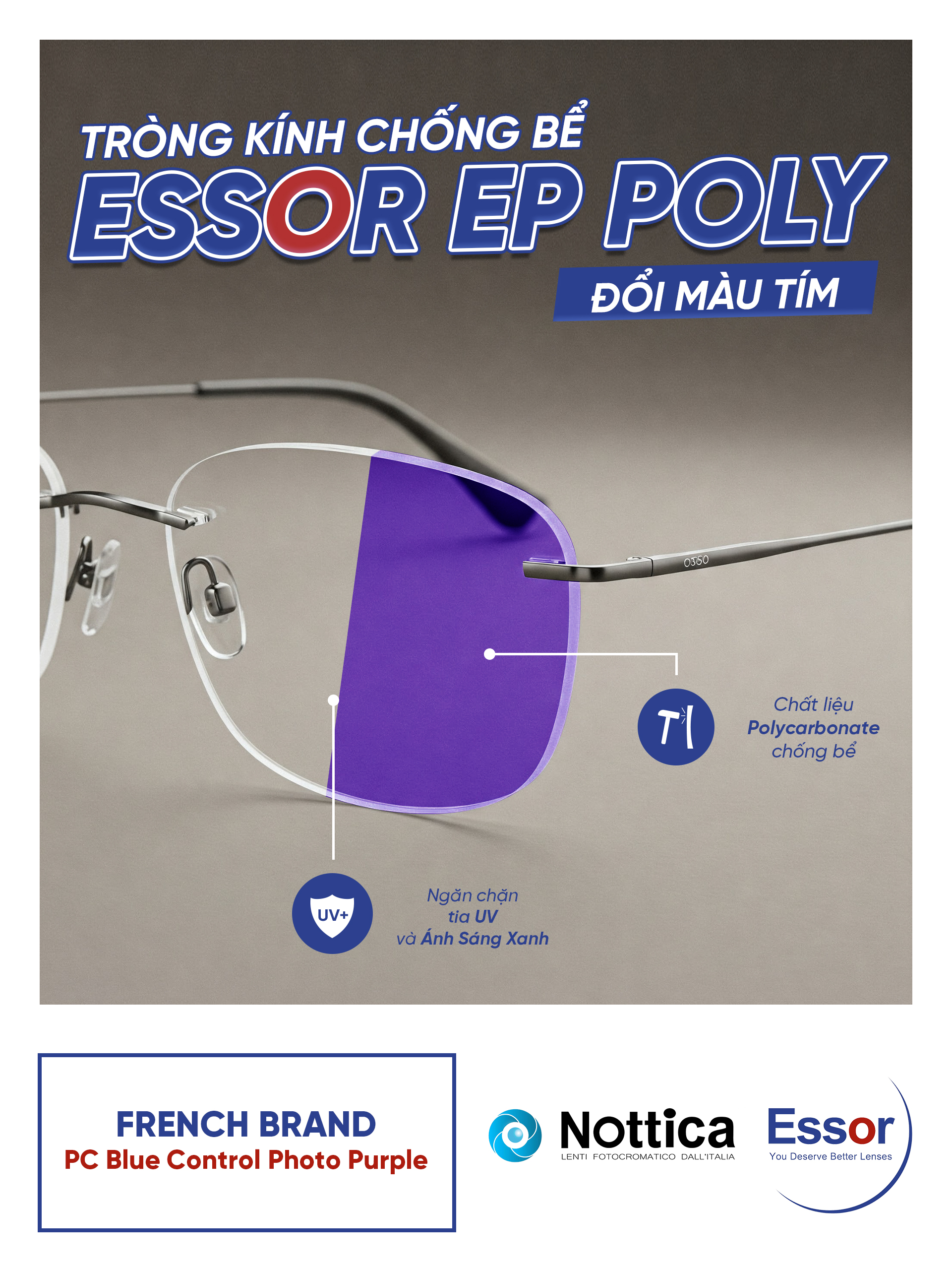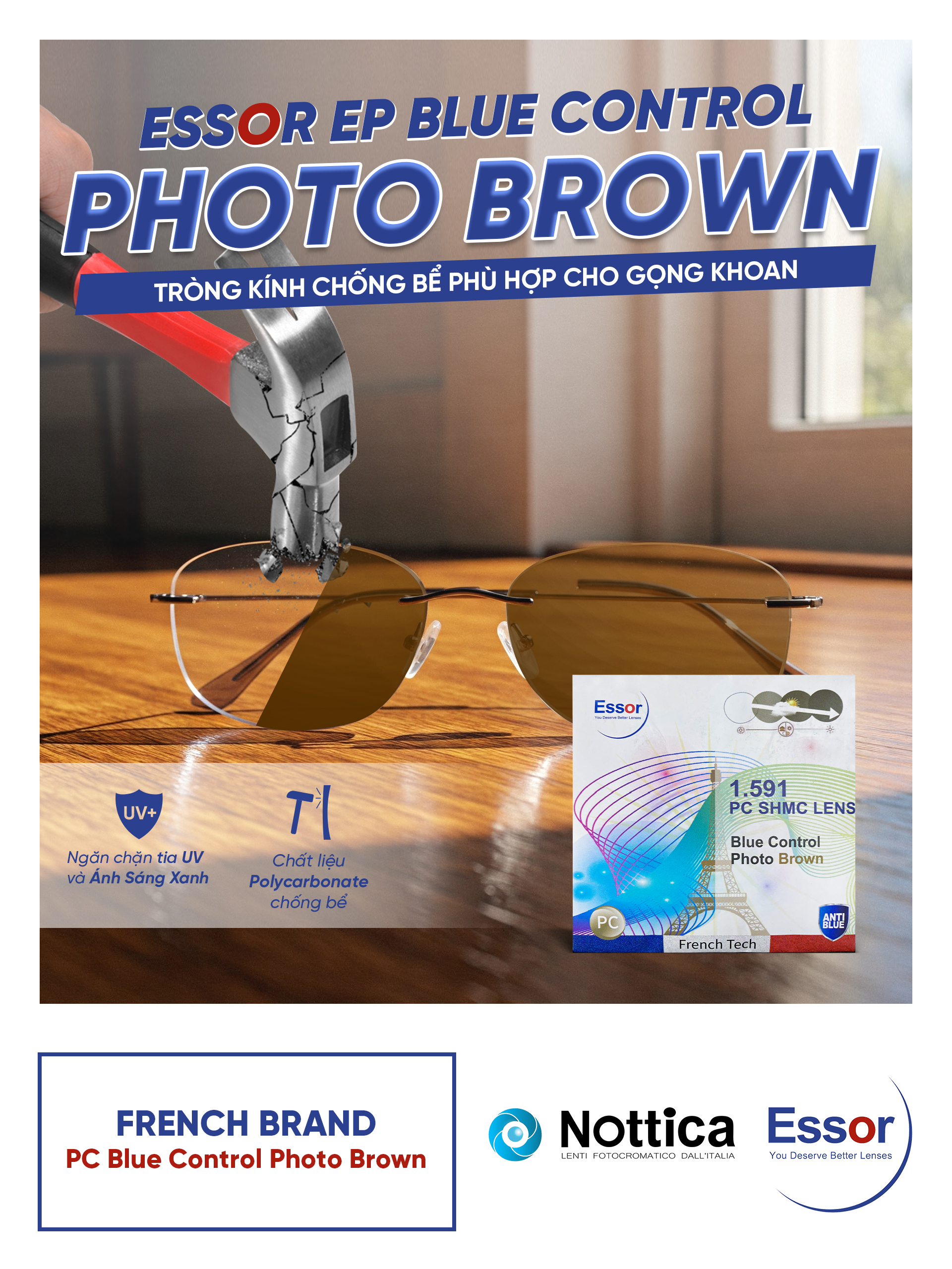 Tròng kính đổi màu khói xanh biển khi tiếp xúc tia UV, với 5 màu thời trang Brown, Blue, Green, Purple, Pink. Công nghệ Blue Control bảo vệ mắt khỏi ánh sáng xanh có hại và chống bể tuyệt đối, là lựa chọn hoàn hảo cho gọng khoan bền chắc và phong cách.